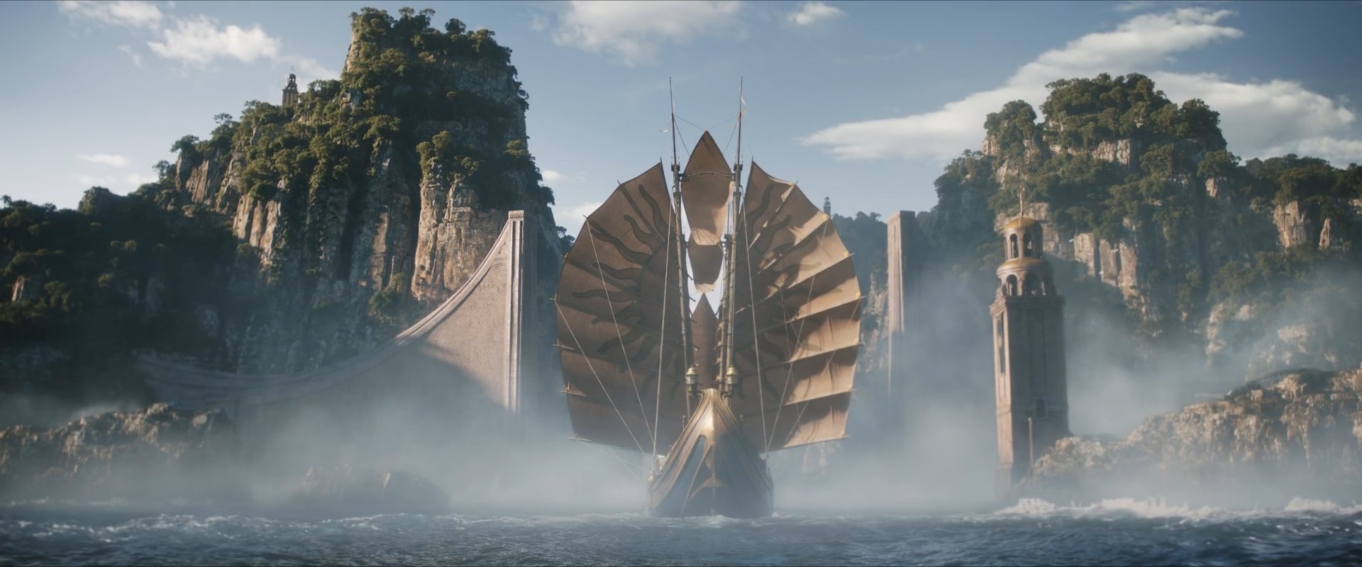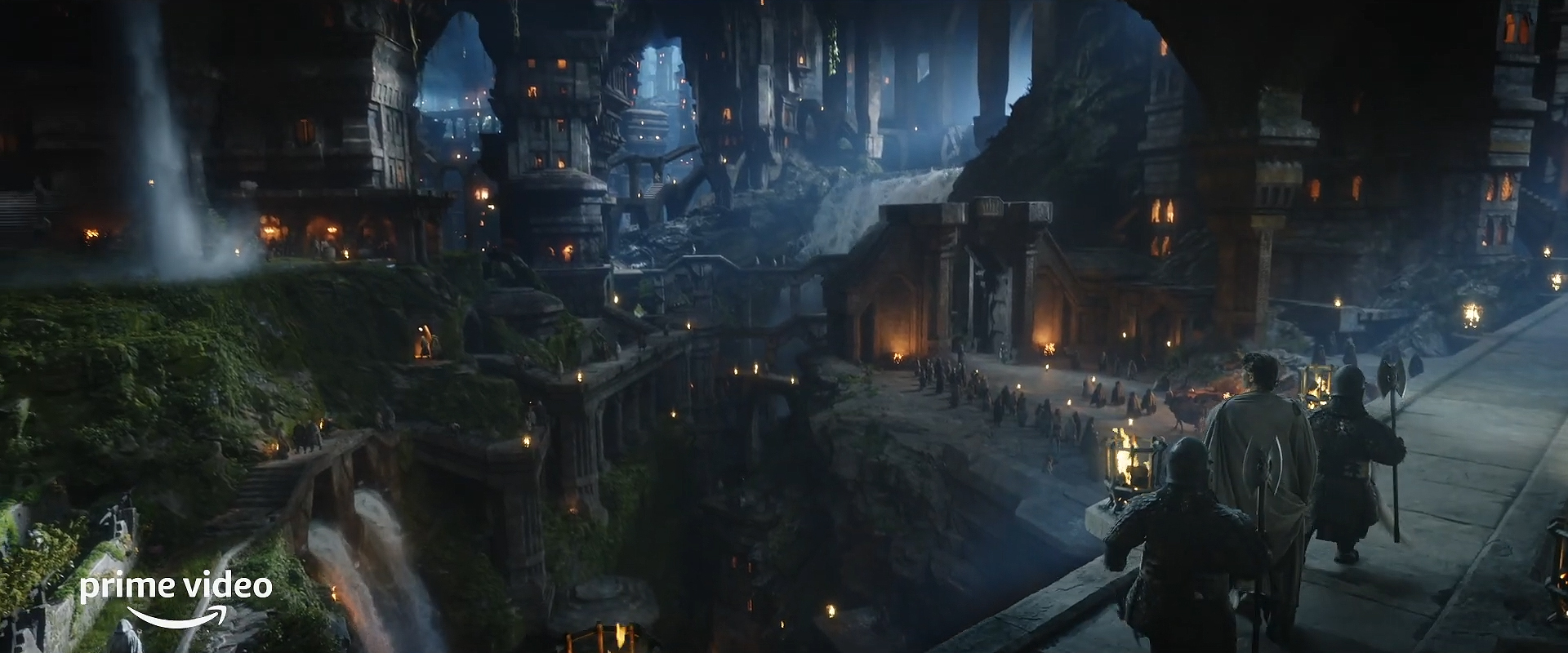 We finally have a first look at one of the most anticipated realms of this show, Khazad-Dum. The overhanging rocks reminds so much of those seen in Erebor, in the prologue of The Hobbit. The stone constructions, however, seem rounder and more elegant, and what can be seen below appears to be an entrance bridge to the kingdom. Another interesting curiosity that we can see in this image is an organized mirror system that serves to illuminate the underground kingdom, reflecting sunlight.