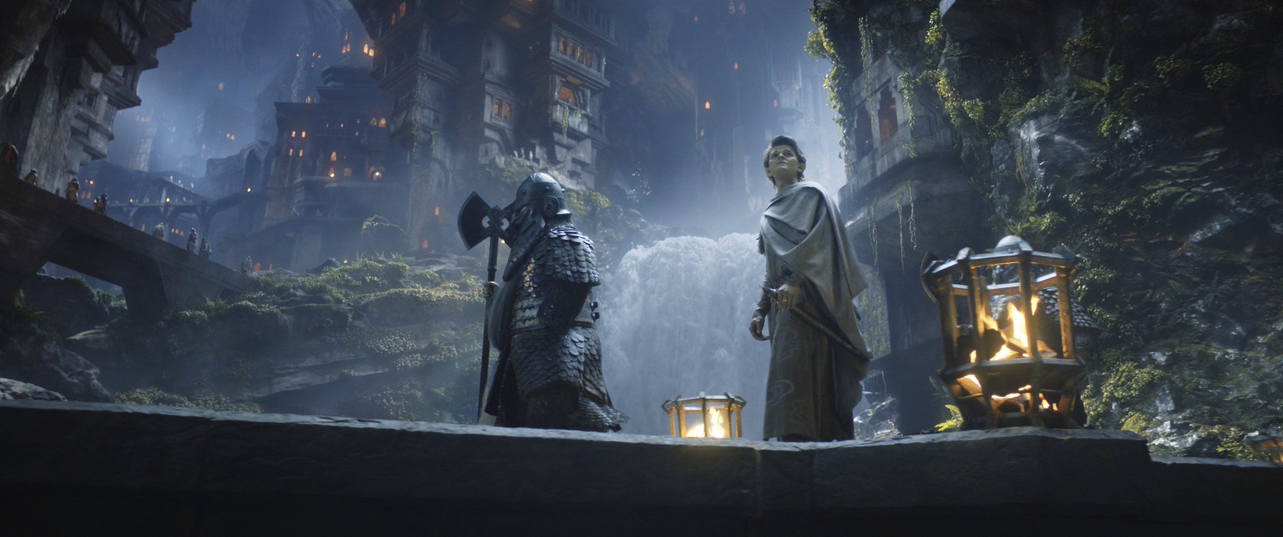 In this beautiful frame we can see Elrond being escorted probably to the throne room of Khazad-Dum. The dwarven realm is as majestic as it is wonderfully elegant. Inside the kingdom there are waterfalls, mosses and vegetation that descends between the rocks, making it shiny and colorful despite the realm is located in great depth. The beauty of the dwarven architecture drops our jaws, and we can’t wait to see more. The striking detail of this image lies in the war masks that the dwarven guards wears, as well as sturdy, scaled armors. From our rumors we know that the dwarves will wear dragon scale armor, a detail that is nothing short of surprising as Durin’s people are the ones who most of all fought against those powerful creatures. It is also worth noting the care of beards, which always appear very long, exactly as often described in books.