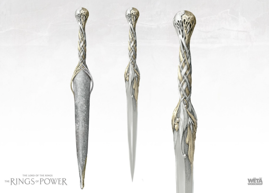 “The sword that Míriel wears is both a relic of the first age and heirloom of the Kings and Queens of Númenor. Its design draws inspiration from some heavily gilded Italian swords of the 1500s. The etched filigree posed a unique challenge as it was far more detailed than any of the other swords we made for the show. These etchings continue onto the blade and contain many first age references that will be familiar to Tolkien fans.”